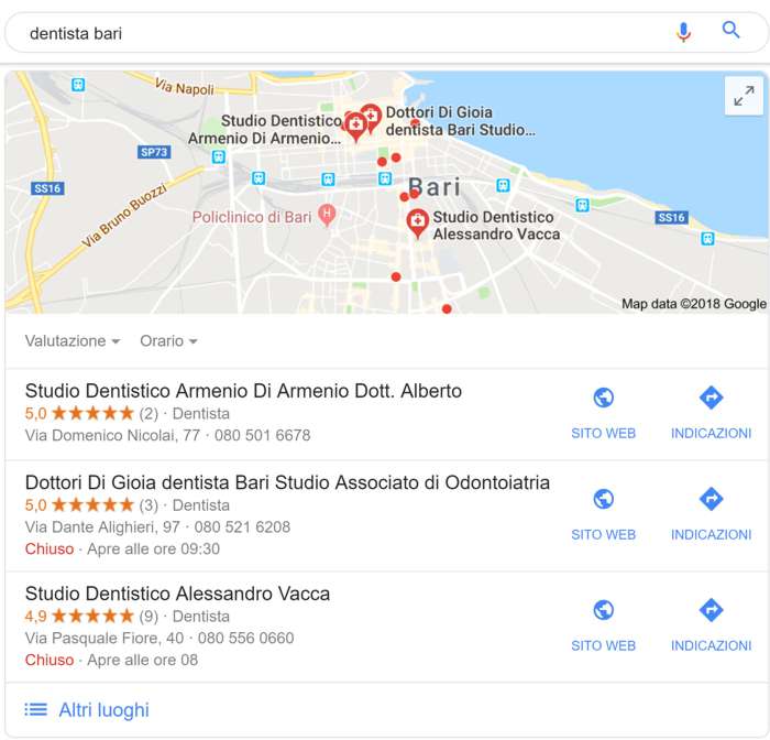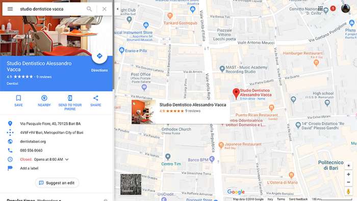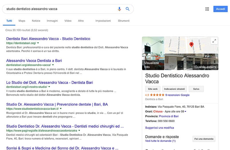 Pour que ce panneau s’affiche, Google doit être certain de l’établissement ciblé. Si la recherche reste trop vague, comme « dentiste à Bari », il sera difficile d’obtenir ce résultat. Mais avec une requête précise, telle que « alessandro vacca cabinet dentaire », la carte du cabinet s’affichera clairement dans cette zone d’information.