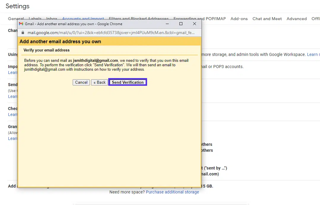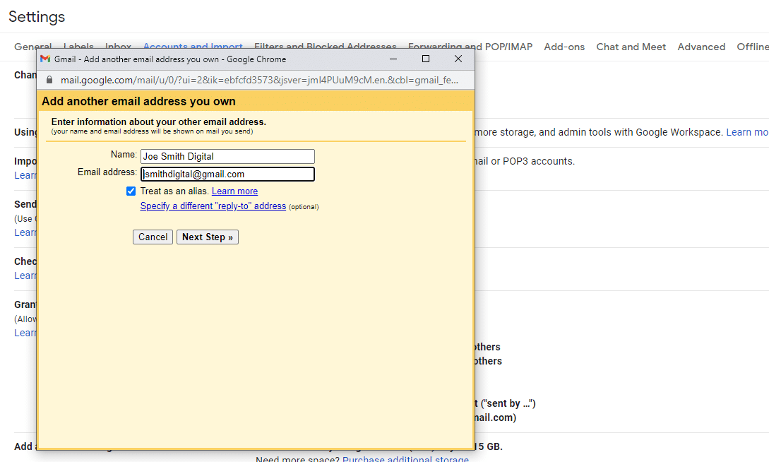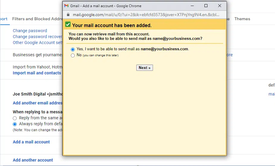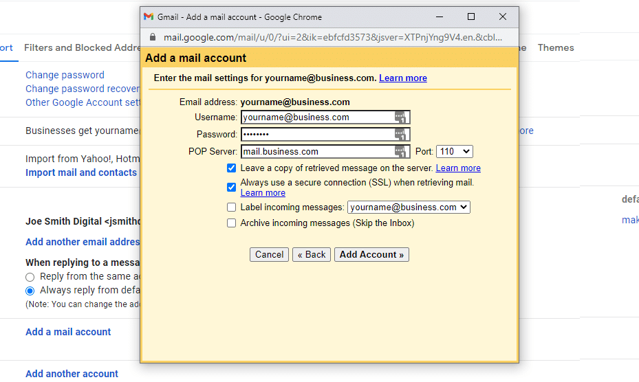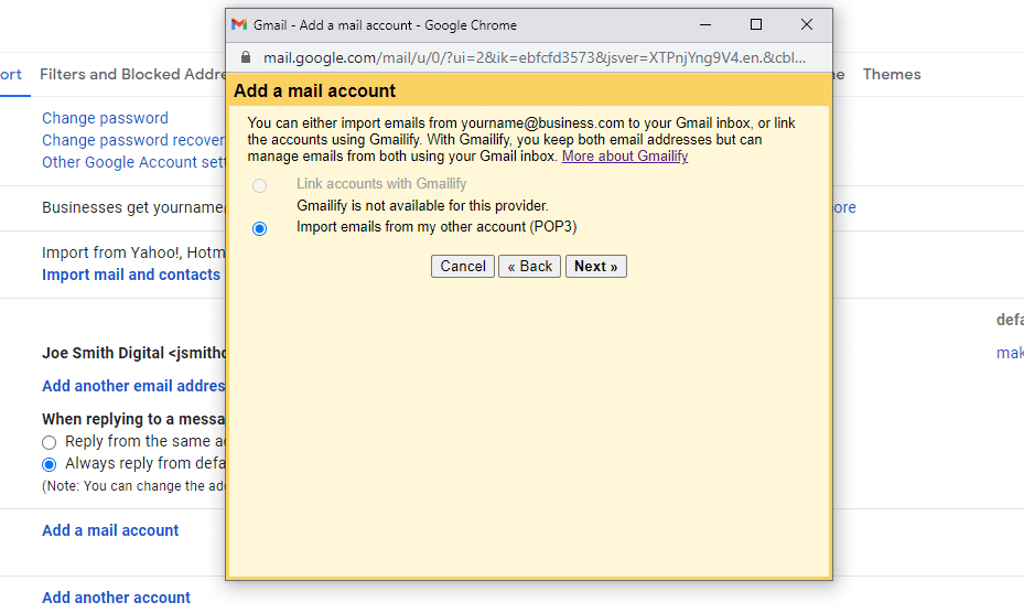 Retournez dans les paramètres du compte principal, puis sélectionnez « Ajouter un compte » dans la section « Vérifier le courrier d’autres comptes ». Entrez l’adresse à relier, puis laissez-vous guider.