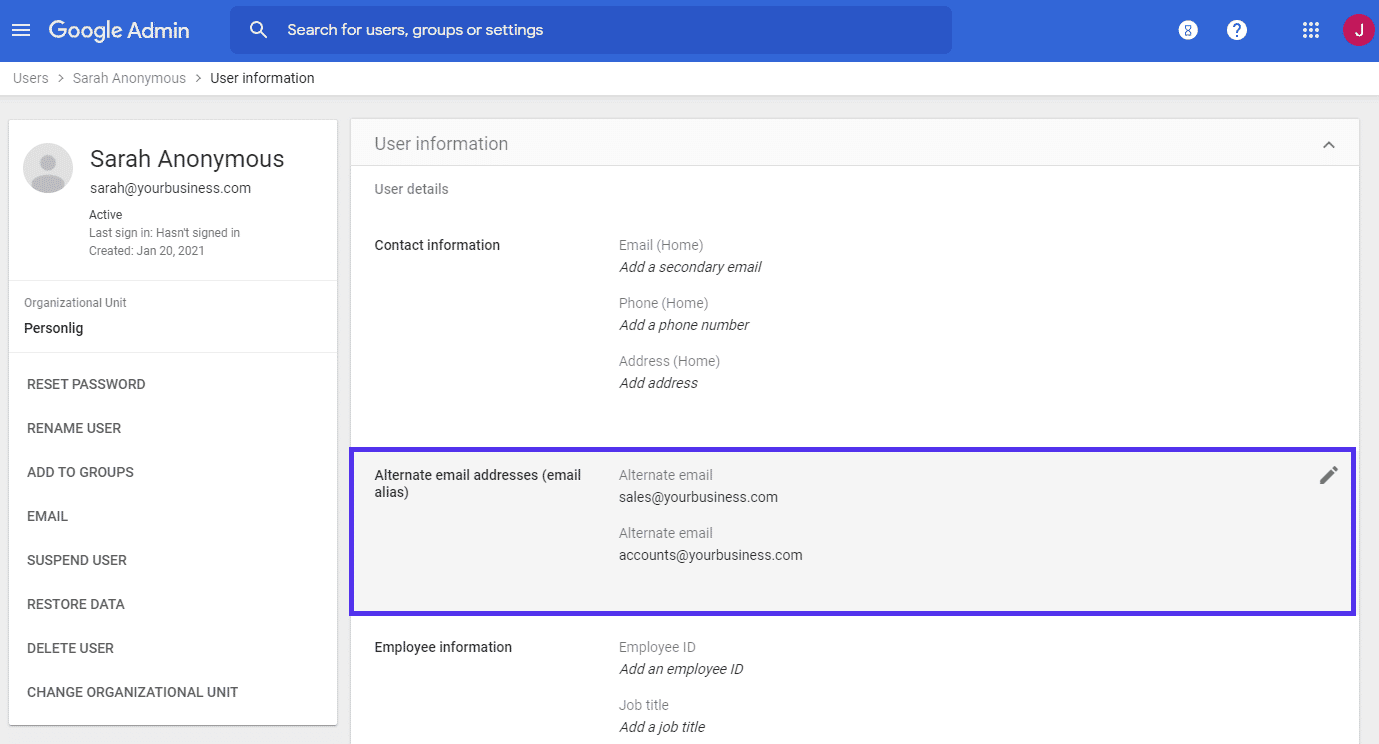 Avec Google Workspace, la configuration des alias se fait en quelques clics, directement pour chaque collaborateur. Fini les procédures complexes : tout est centralisé.