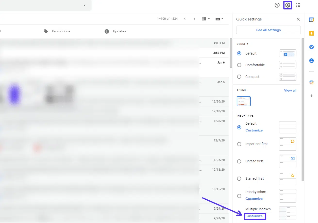 Dans les paramètres rapides, cliquez sur « Personnaliser » à côté de « Boîte de réception multiple ».