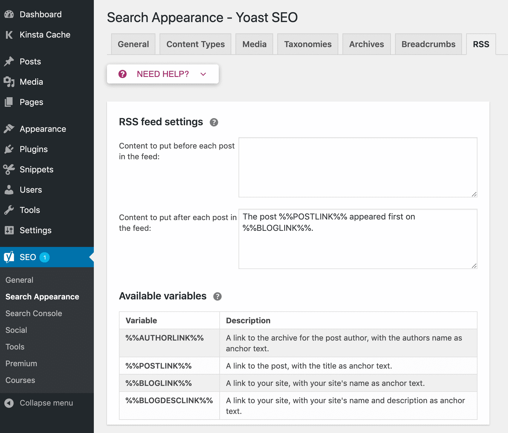 La carte RSS permet d’insérer du contenu personnalisé avant ou après vos articles dans les flux RSS. Vous pourrez y intégrer des variables, comme un lien automatique vers votre site pour garantir la citation d’origine :