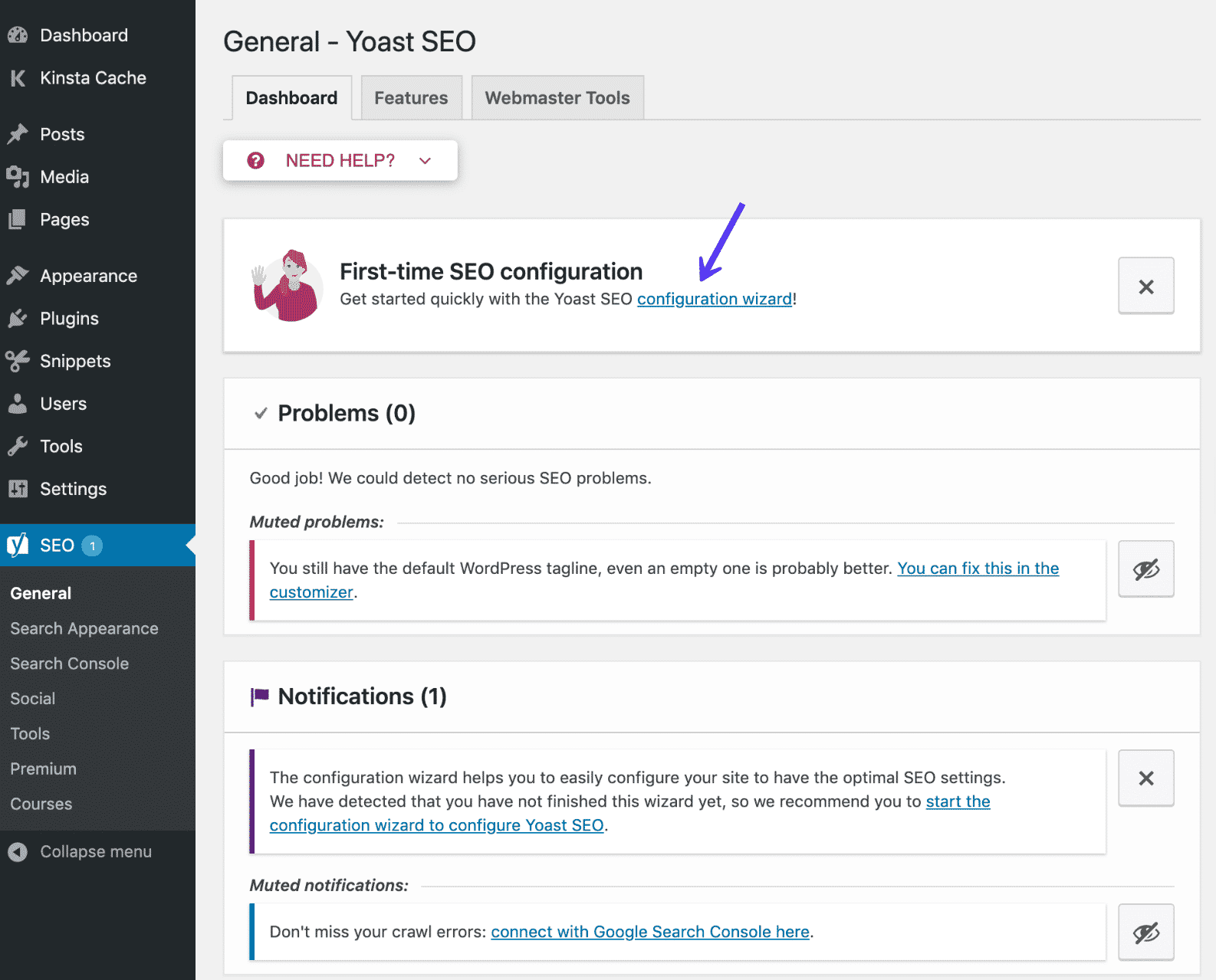 Cliquez sur ce lien, puis sur la page d’accueil de l’assistant, sélectionnez Configurer Yoast SEO.