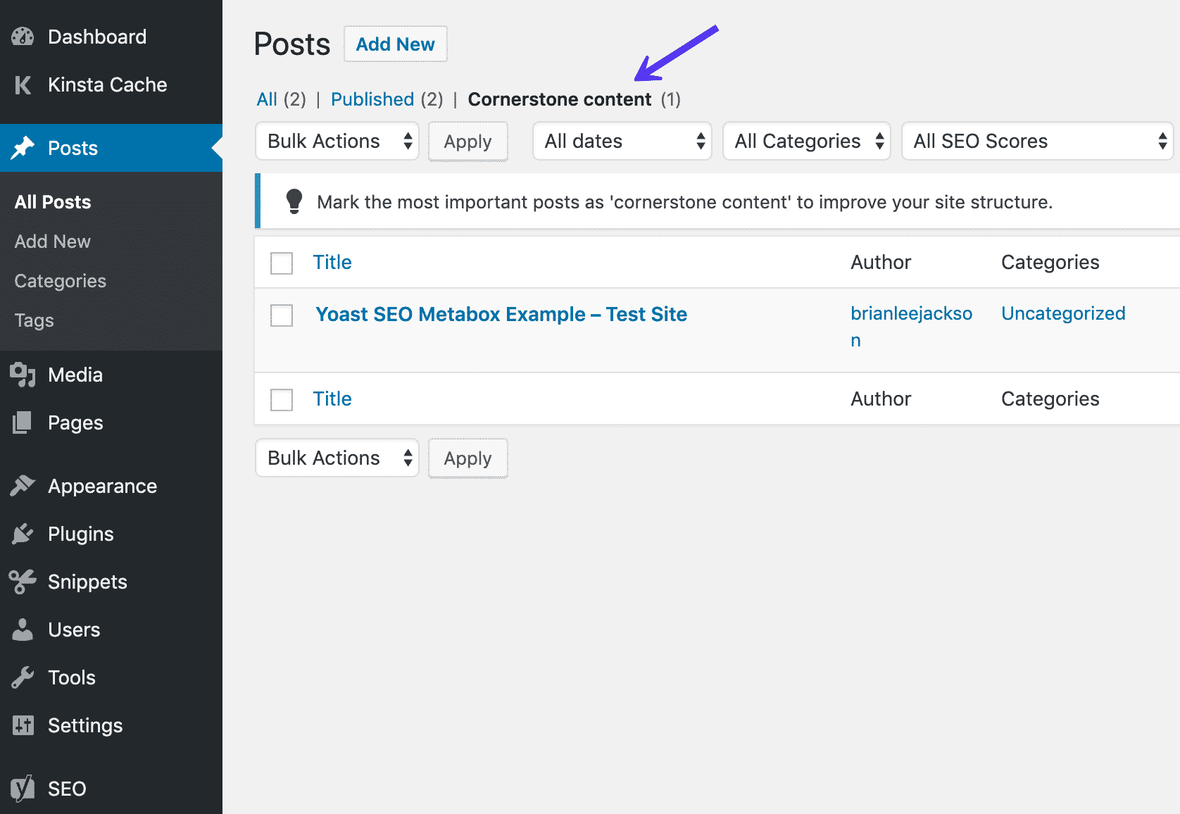 La section contenu Cornerstone vous permet de désigner certains articles ou pages comme des contenus piliers, c’est-à-dire ceux sur lesquels repose l’autorité de votre site.