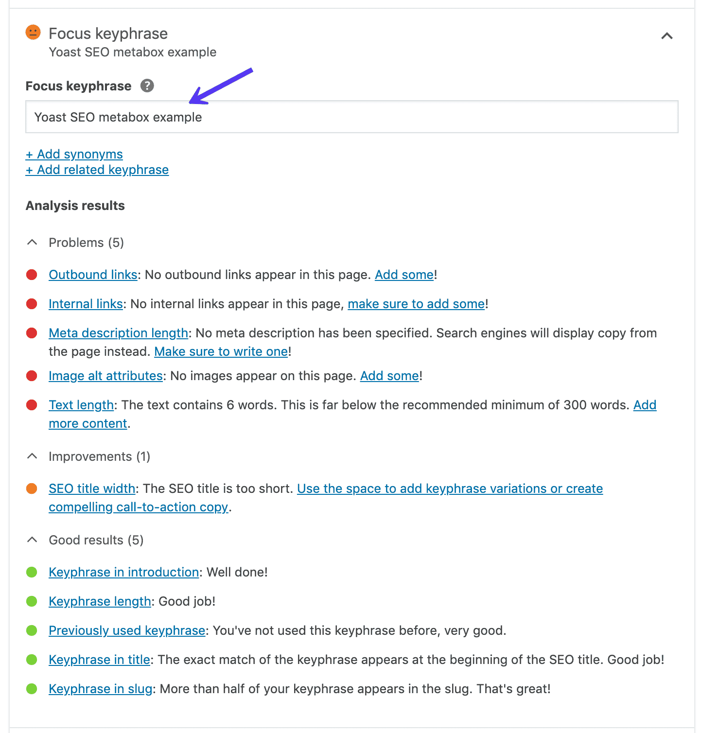 Il est recommandé d’avoir réalisé une recherche de mots-clés en amont, puis de renseigner ici le terme principal, afin que Yoast analyse la pertinence de votre contenu par rapport à cette cible.