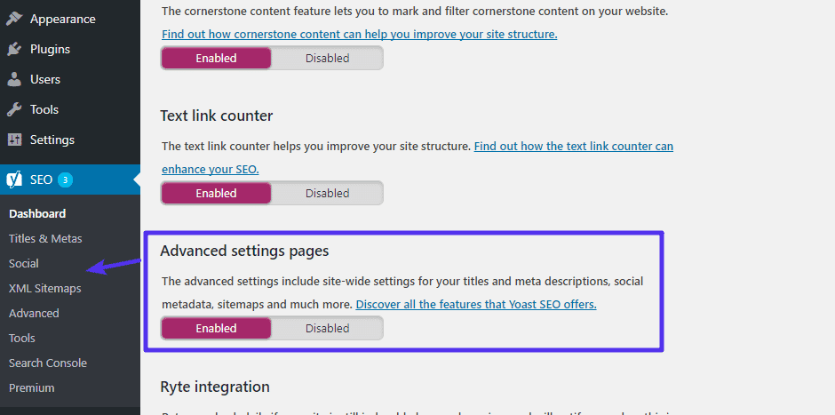Pour accéder à ces options, rendez-vous dans l’onglet Fonctionnalités du tableau de bord et activez les Pages Paramètres avancés.