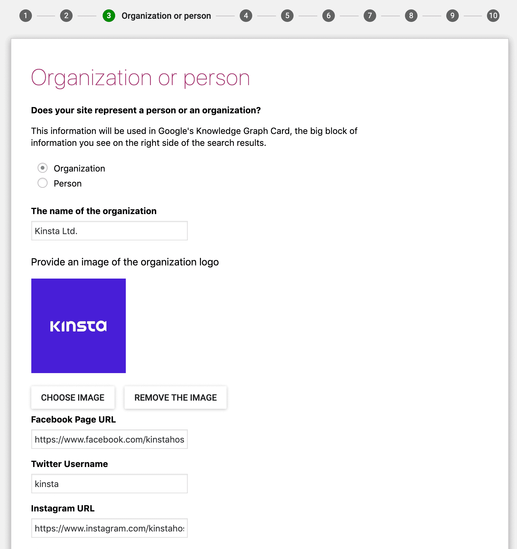 Cette étape permet à Yoast de transmettre des données enrichies à Google afin de créer une fiche Knowledge Graph. Plus vous êtes précis, plus votre site peut se démarquer dans les résultats :