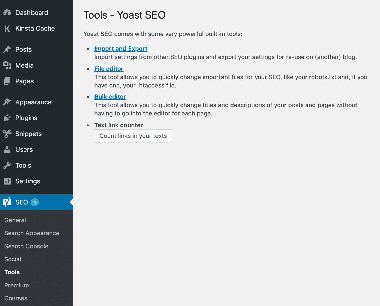 Enfin, la rubrique Outils donne accès à divers éditeurs (titres, descriptions, etc.), ainsi qu’à l’import/export de vos réglages SEO :