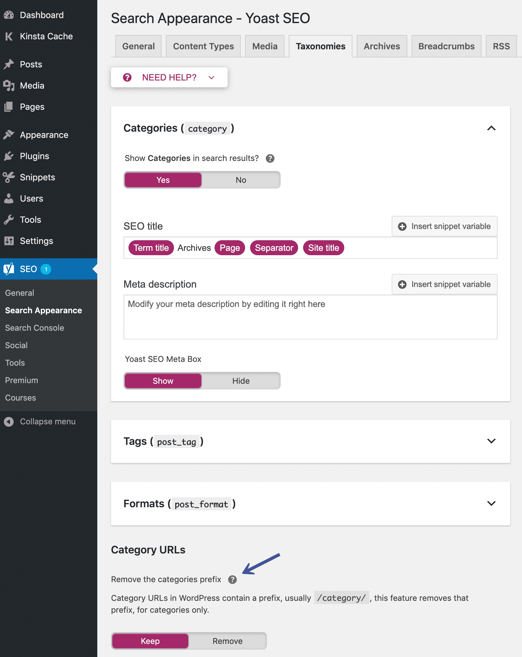 Dans l’onglet Taxonomies, vous pouvez optimiser la structure des URLs de vos catégories, par exemple en supprimant le préfixe « category » :