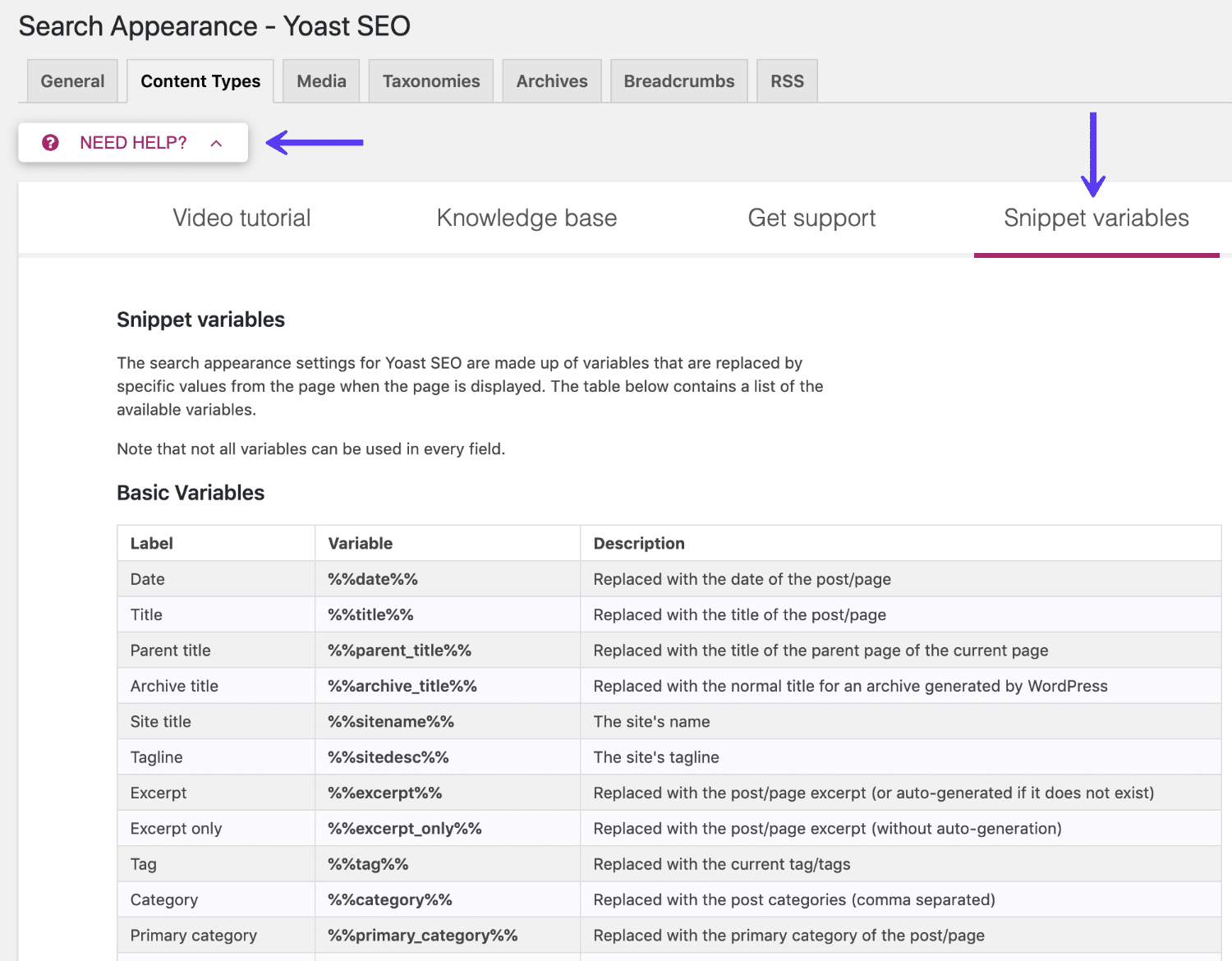 Vous accédez à la liste complète des variables en cliquant sur Avez-vous besoin d’aide ?, puis Variables des extraits :